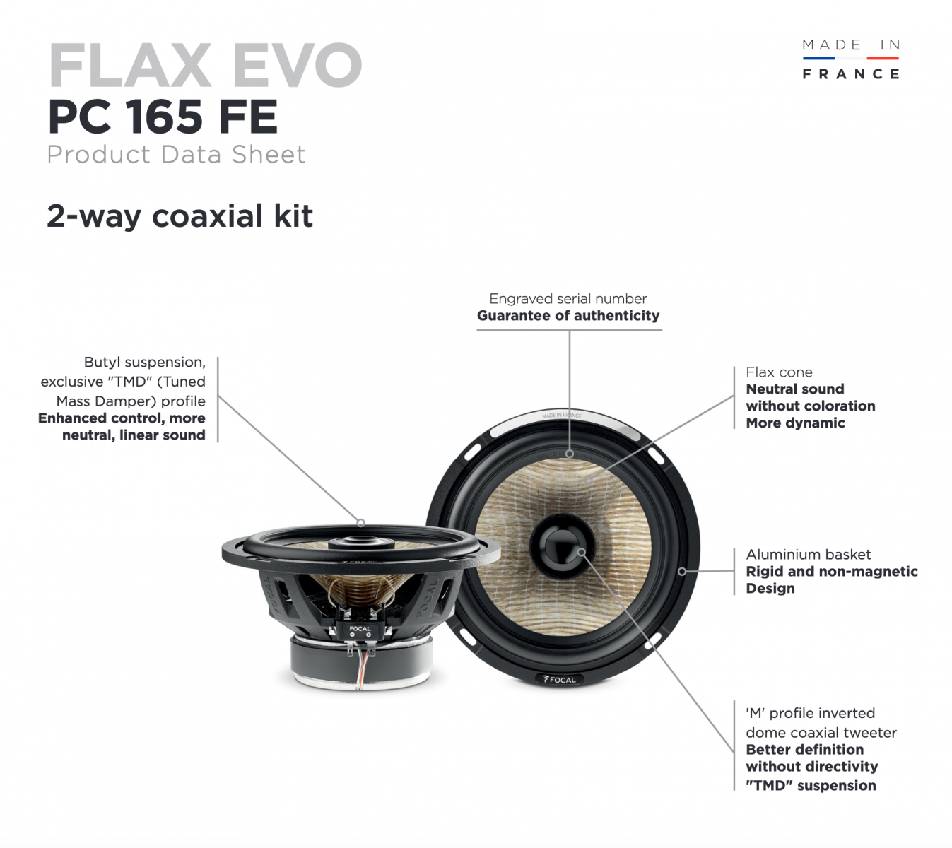 Equipped with the Flax cone, the woofers from the PC 165 FE kit deliver a very dynamic, natural sound without colouration. In addition, the TMD (Tuned Mass Damper) surround they incorporate stabilises the surround to achieve better control, and even greater neutrality and linearity.