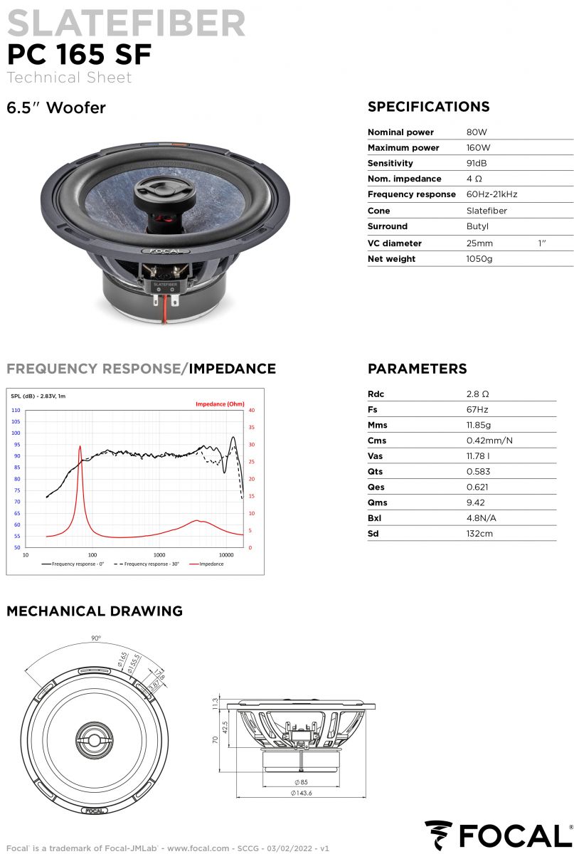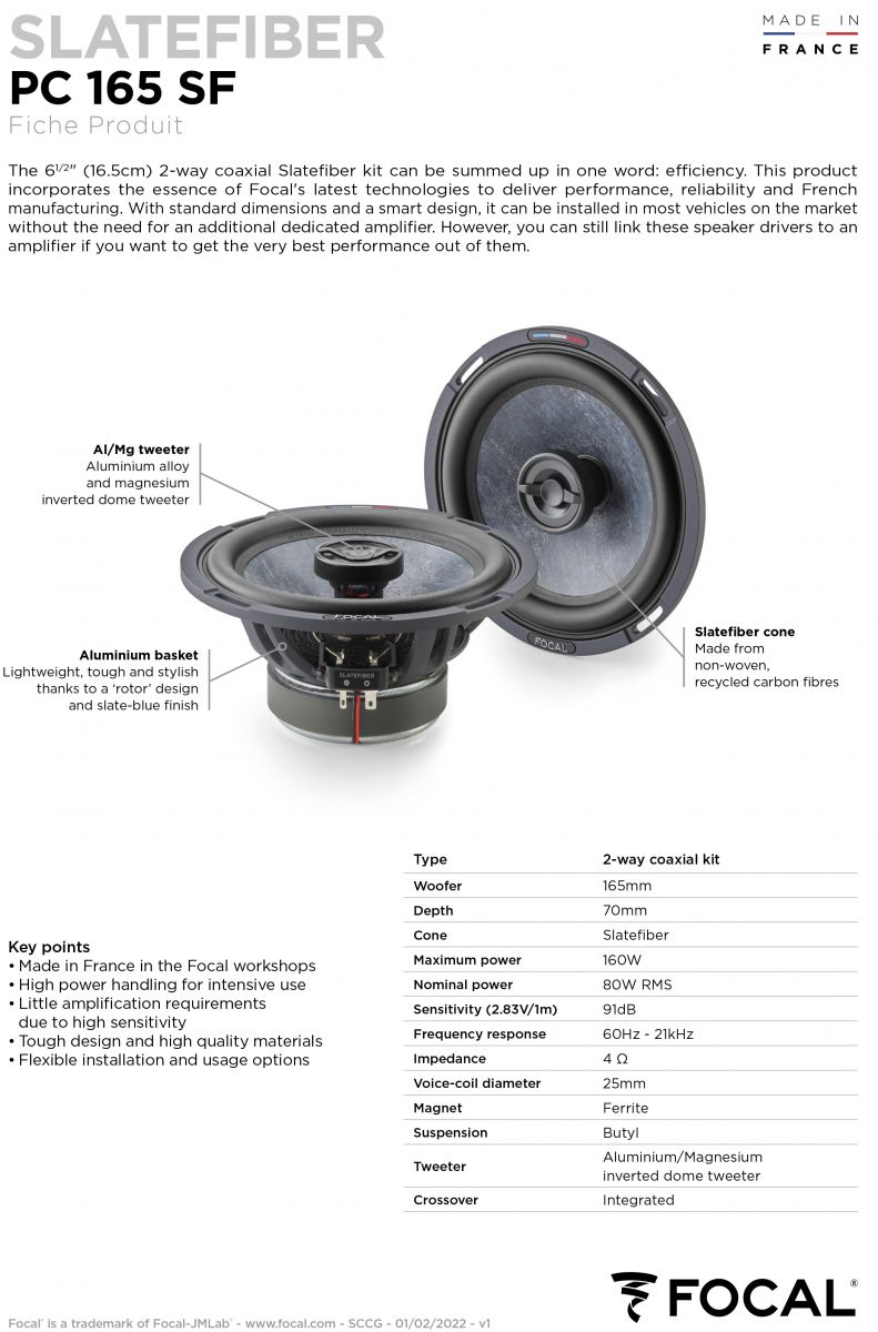 The 2-way coaxial kit PC 165 SF incorporates the essence of Focal’s latest technologies to deliver performance, reliability and French manufacturing. Its exclusive Slatefiber cone helps create a rich soundscape. Its standard dimensions of 61/2” (165mm) and smart design means it can be installed in most vehicles on the market. Last but not least, its high sensitivity offers smooth amplification: PC 165 SF can be directly connected to the original car radio or be used with an amplifier to make the most of its performance.